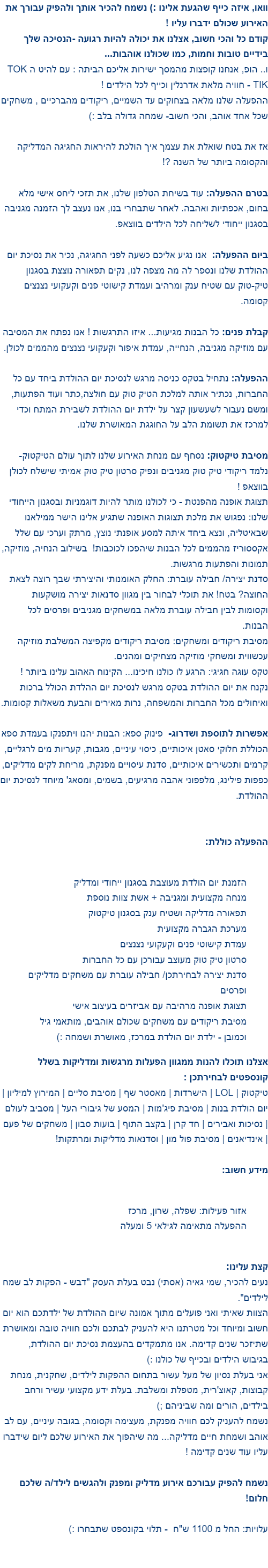 הפעלות קסומות ומהנות לפי קונספט שתבחרו. חגיגה שכולה הרפתקאה בלתי נשכחת.