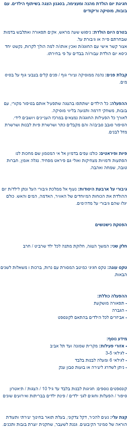 מגוון נושאי ימי הולדת ופעילויות מרתקות ומלאות בחוויות שכל הילדים הכי אוהבים.