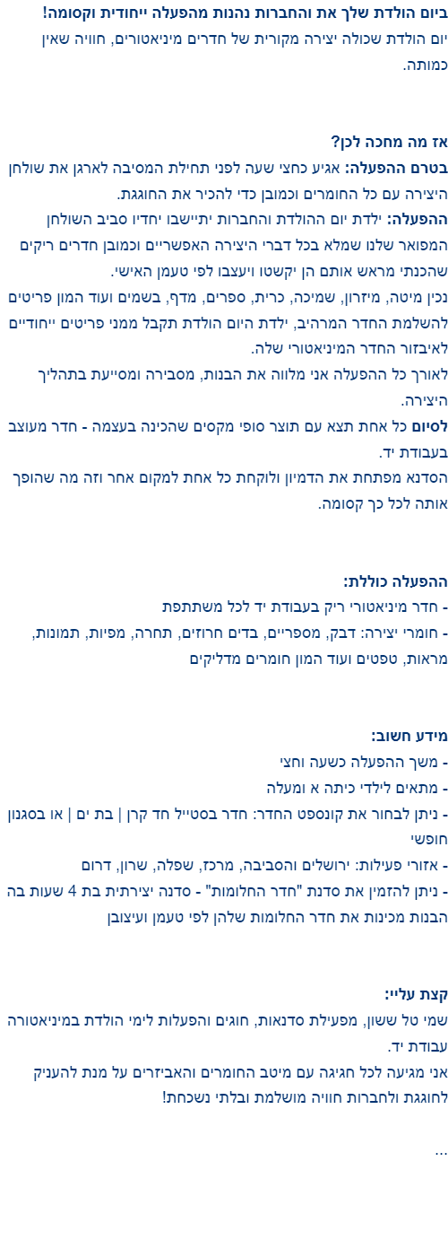 תודה רבה טל על הפעלה מדהימה עם ערך מוסף מהמם שמקשט את החדר? הבנות היו בריכוז מופתי וממש התבאסו כשנגמר! ליהי מאוד נהנתה ושמחה שהיו דברים ייחודים לה