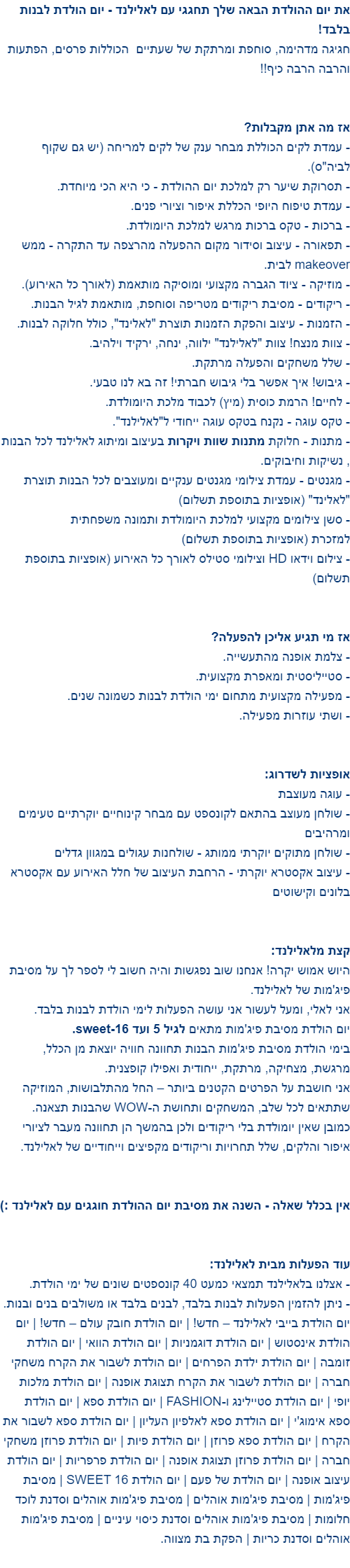 לכל המתלבטות תהיו סמוכות ובטוחות שיומולדת מוצלחת נערכת רק ע"י לאלילנד!!!!