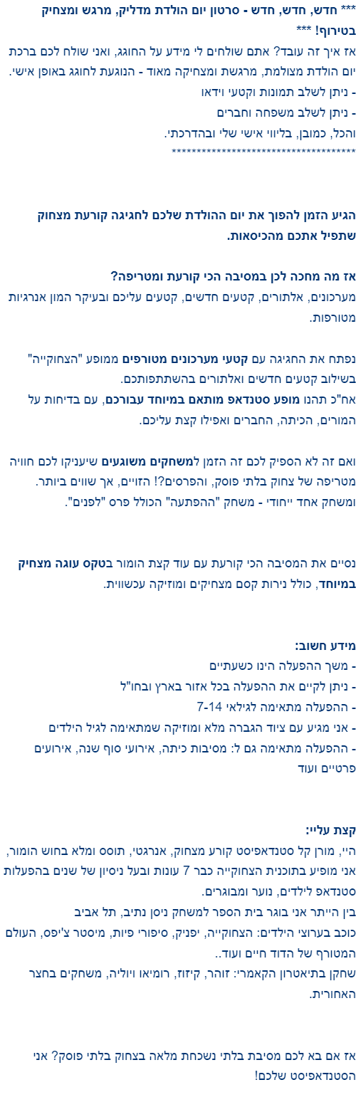 תודה רבה רבה רבה על יום הולדת מהסרטים הילדים נהנו וצחקו בלי סוף אין עליך עשית לנו את היום הולדת ליפה יותר. אין עליך. מסרתי את הטלפון שלך כבר לשתי חברות. תותח!