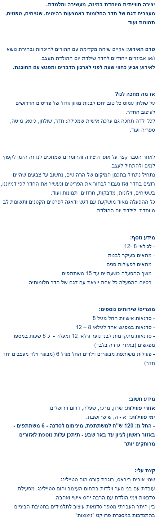 אורית ודודו היקרים! ראשית תודה רבה! רוצים לומר לכם תודה תודה תודה על פעילות מדהימה. הבנות היו שקועות וממוקדות שום דבר לא עניין אותן פרט ליצירה שזה לגמרי נדיר. הייתם סבלניים נחמדים ומאד אדיבים. קיבלנו פידבקים מההורים של הבנות שמסרו שהחדר פשוט מהמם והבנות נהנו בצורה יוצאת מן הכלל!!!! שוב תודה רבה.