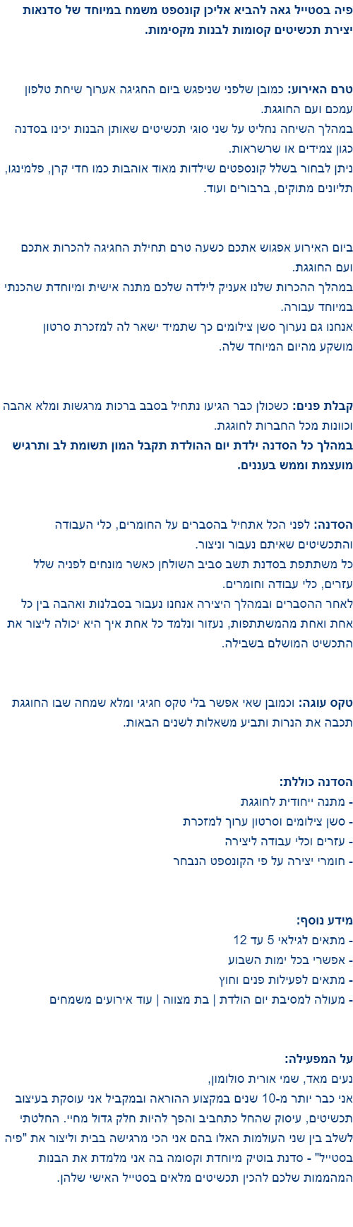 היה מקסים! תודה רבה, היית מהממת וסבלנית! ראיתי שבזמן הסדנה הבנות היו מאושרות. חגגנו בת מצווה מיוחדת ואינטימית הודות לך! והסירטון פשוט מקסים!